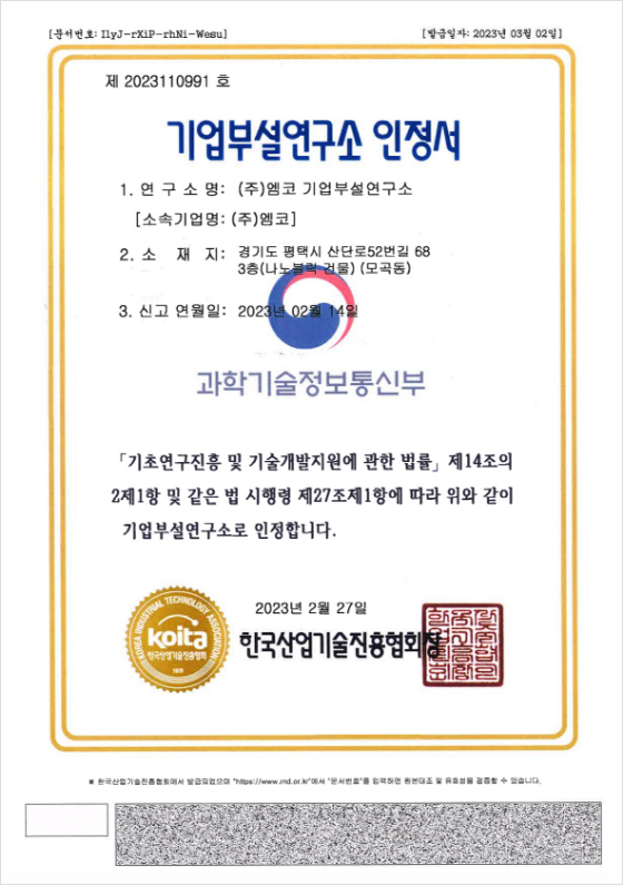 기업부설연구소인증서